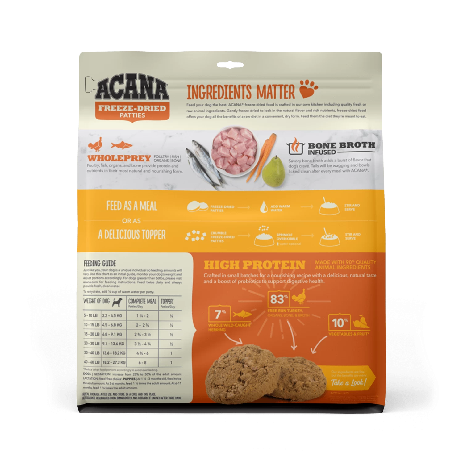With all the benefits of raw nutrition and none of the mess, ACANA® Freeze-Dried Food, Free-Run Turkey Recipe satisfies your dog’s natural cravings in a convenient, freeze-dried form. Made from 90%* quality animal protein from free-run turkey** and whole wild-caught herring, and infused with delicious bone broth, you can serve morsels or patties on their own or as a topper at mealtime.