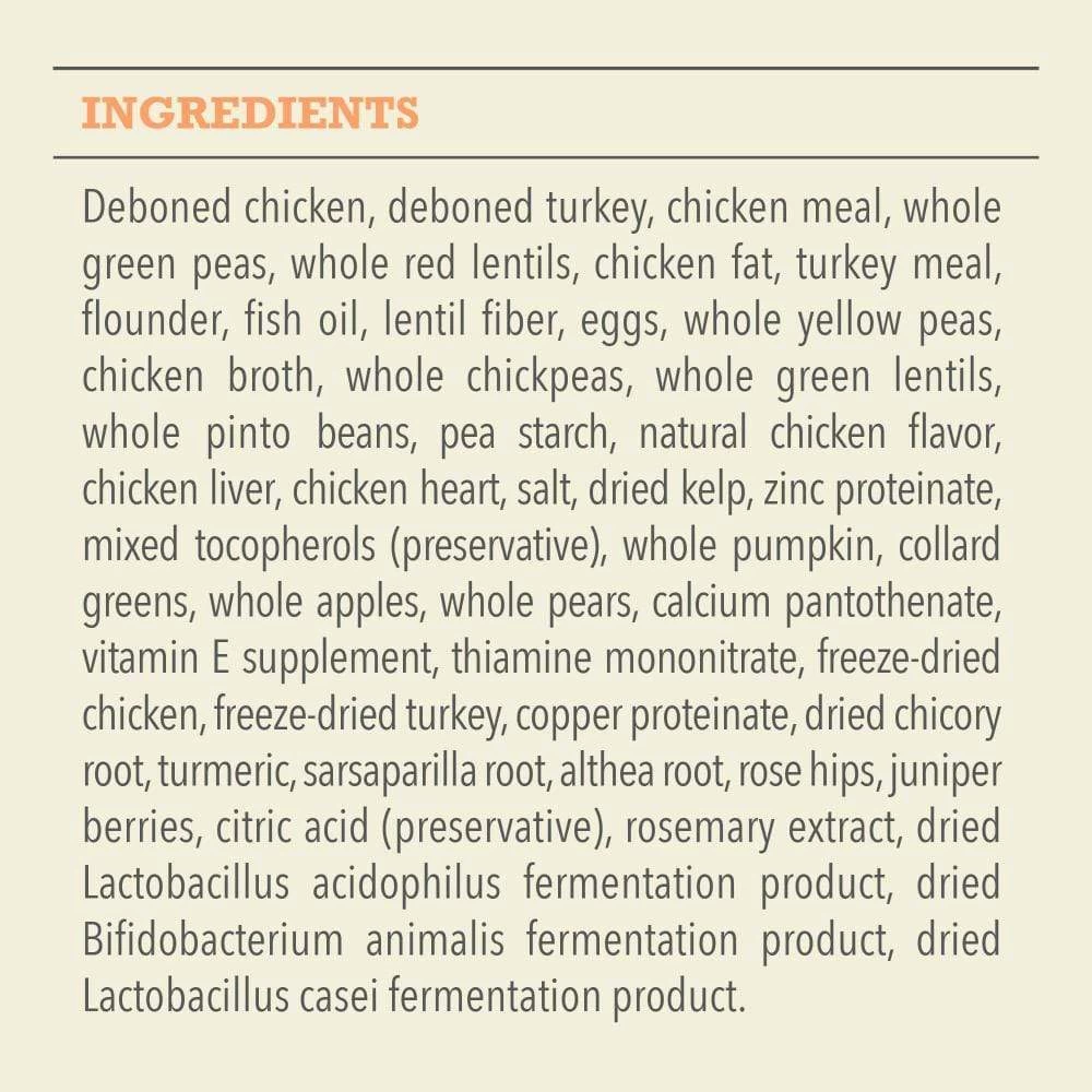 Deboned turkey, deboned chicken, chicken meal, turkey meal, whole green peas, whole red lentils, whole yellow peas, chicken fat, flounder, pollock oil, lentil fiber, eggs, chicken broth, whole chickpeas, whole green lentils, whole pinto beans, natural chicken flavor, chicken liver, chicken heart, chicken cartilage, chicken gizzard, salt, mixed tocopherols (preservative), dried kelp, whole pumpkin, collard greens, carrots, whole apples, zinc proteinate, calcium pantothenate, thiamine mononitrate, freeze-dried chicken liver, freeze-dried turkey liver, copper proteinate, chicory root, turmeric, sarsaparilla root, althea root, rose hips, juniper berries, dried lactobacillus acidophilus fermentation product, dried bifidobacterium animalis fermentation product, dried lactobacillus casei fermentation product.