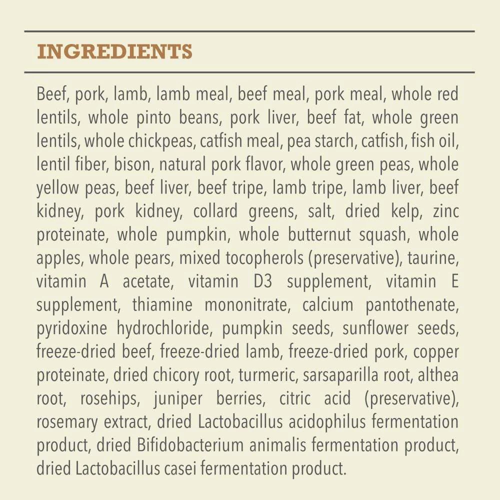 Deboned beef*, deboned pork*, deboned lamb*, lamb meal, beef meal, pork meal, whole green peas, red lentils, pinto beans, beef liver*, beef fat, catfish meal, chickpeas, green lentils, whole yellow peas, deboned bison*, whole catfish*, herring oil, sun-cured alfalfa, natural pork flavor, beef tripe*, lamb tripe*, lamb liver*, pork liver*, beef kidney*, pork kidney*, pork cartilage*, dried kelp, whole pumpkin*, whole butternut squash*, kale*, spinach*, mustard greens*, collard greens*, turnip greens*, carrots*, Red Delicious apples*, Bartlett pears*, freeze-dried beef liver, freeze-dried lamb liver, freeze-dried pork liver*, pumpkin seeds, sunflower seeds, zinc proteinate, mixed tocopherols (preservative), chicory root, turmeric, sarsaparilla root, althea root, rosehips, juniper berries, dried lactobacillus acidophilus fermentation product, dried bifidobacterium animalis fermentation product, dried lactobacillus casei fermentation product.