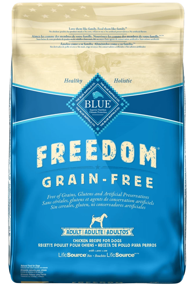 - GRAIN FREE DOG FOOD: BLUE Freedom grain free adult dog food is specifically formulated to meet the nutritional requirements of adult dogs to help provide energy for an active life. Plus, it contains omega 3 & 6 fatty acids to support skin and coat health.