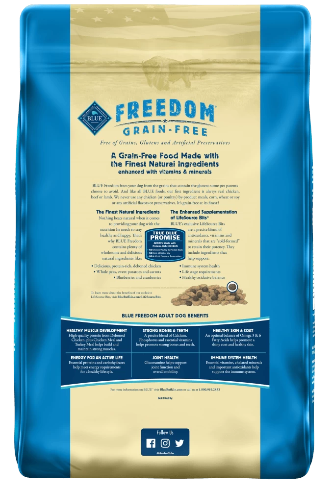 BLUE Freedom® is a delicious, 100% grain free formula that contains no gluten. All BLUE Freedom dog food recipes feature high-quality real meat with no chicken (or poultry) by-product meals. Set your dog free from grains with this tasty, satisfying diet. BLUE Freedom dog food is a product of the Blue Buffalo company. Based in the United States, Blue Buffalo makes premium-quality pet foods featuring real meat, fruit and vegetables.