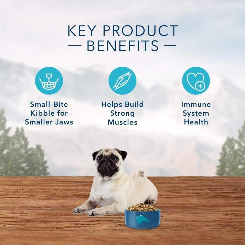 BLUE Wilderness Small Bite Dry Dog Food is made with more of the meat dogs love and features a unique kibble size ideal for smaller jaws. This formula contains a precise balance of carbohydrates and calories to meet your best friend’s energy requirements. BLUE Wilderness dog food is a product of the Blue Buffalo company. Based in the United States, Blue Buffalo makes premium-quality pet foods featuring real meat, fruit and vegetables.