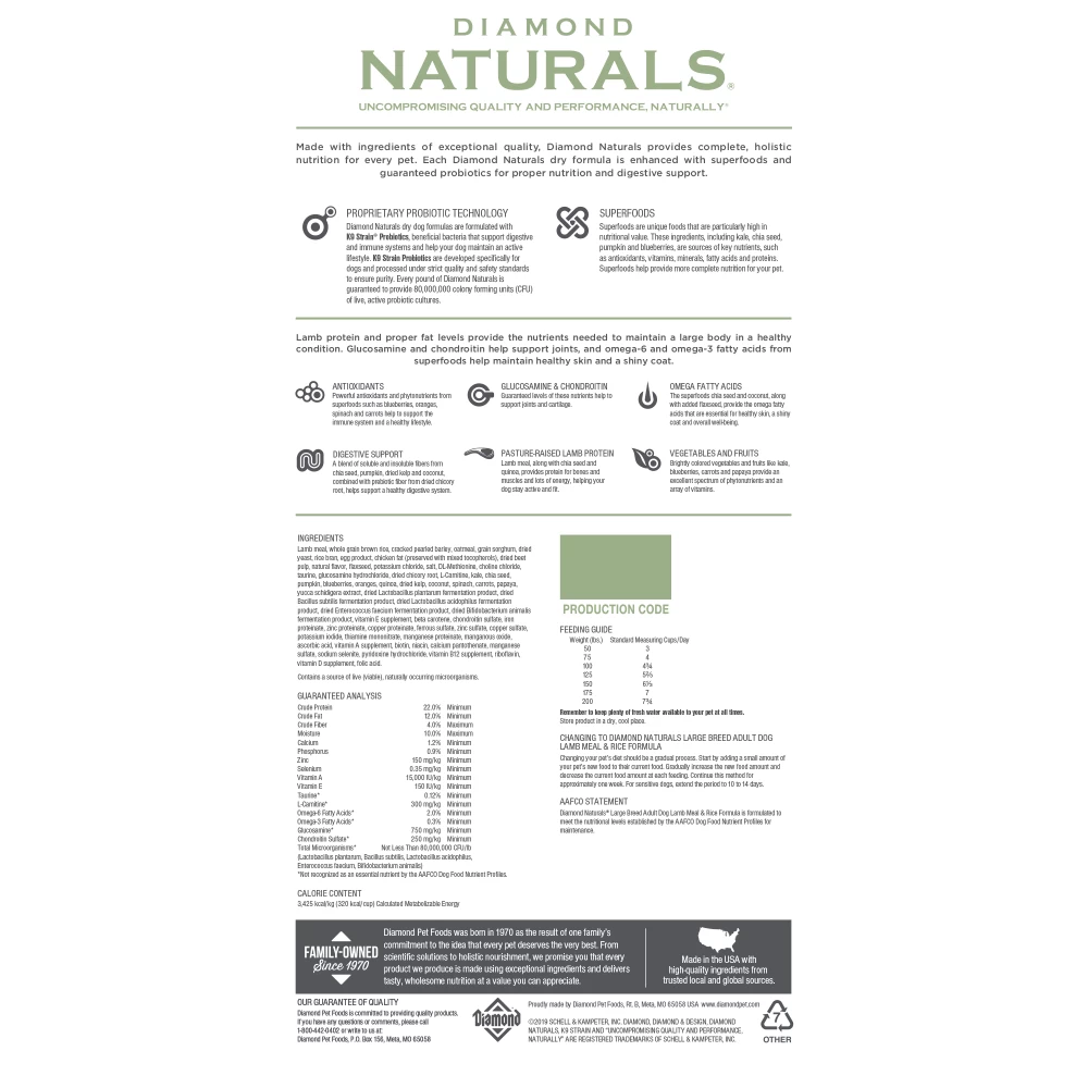 Lamb protein and proper fat levels provide the nutrients needed to sustain a large body while maintaining ideal body condition. Glucosamine and chondroitin help support joints, and omega-6 and omega-3 fatty acids from super foods help maintain healthy skin and a shiny coat. For dogs that may have sensitivities to other protein sources, lamb is a tasty alternative. – Real lamb protein is a tasty alternative for dogs sensitive to other protein sources