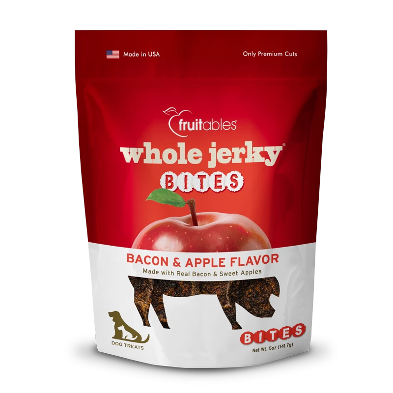 Fruitables Whole Jerky Bites contain the great flavor of real bacon along with the nutritional content of apples. The Jerky Bites are small bite sized pieces that are perfect for snacking, and can also be used as a training treat. It is a grain-free and gluten-free product that contains only 3 premium ingredients. There are No artificial ingredients, fillers or nitrates. Fruitables proudly sources their ingredients from the USA and the treats are produced in an USDA certified organic facility.