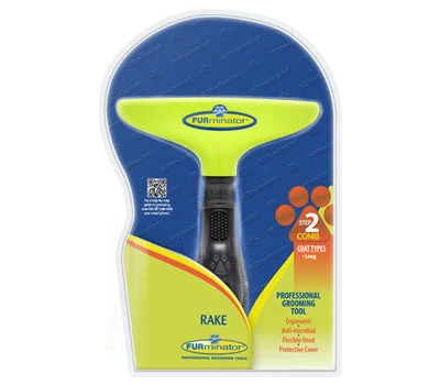 Grooming rake with rotating teeth removes loose hair, tangles and prevents mats.