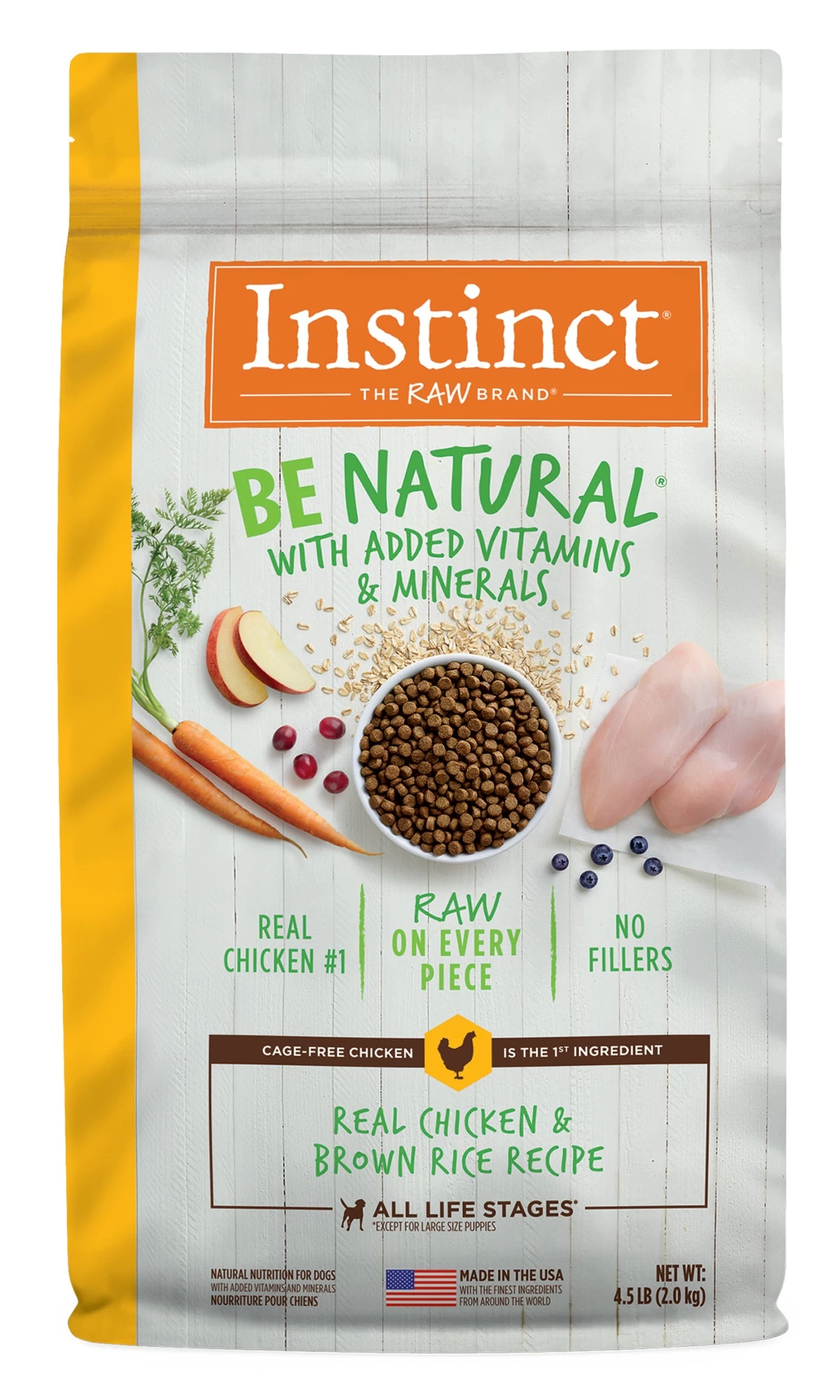 Natural nutrition begins here. Instinct Be Natural Real Chicken & Brown Rice Recipe starts with cage-free chicken and never contains filler, corn, wheat, soy or by-product meals or artificial preservatives and colors. Guided by our belief in the power of raw, each piece is tumbled with crushed freeze-dried raw chicken – raising the bar in nutrition and taste.