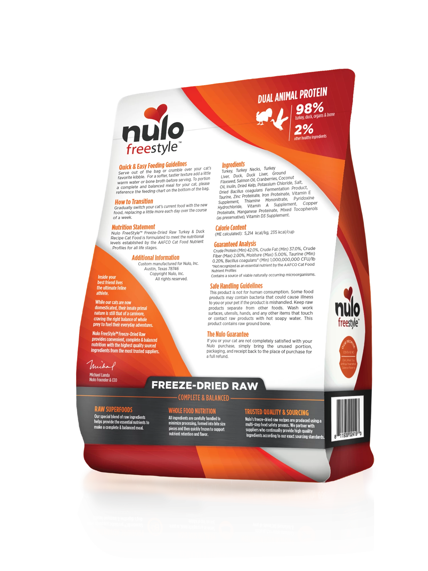 Use Nulo Freeze-Dried Raw as a topper on kibble or a full meal for your little athlete. Our Turkey & Duck recipe contains 98% turkey, duck, organs & bone and functional ingredients like cranberries and dried kelp for superior nutrition. Your best friends won’t be able to resist mealtime when they get their first taste of this Nulo Freeze-Dried Raw recipe.