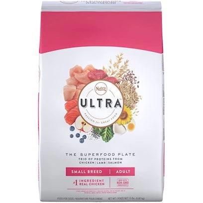 NUTRO ULTRA Small Breed Adult Dry Dog Food is specially formulated to meet the needs of small breed adult dogs. Nutro Ultra The Superfood Plate dog food features a trio of proteins from chicken, lamb, and salmon and is crafted with an exclusive superfood medley of 15 superfoods, like chia seeds, kale, coconut, blueberries, and more.