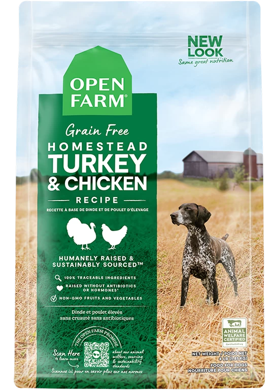 Open Farm Homestead Turkey and Chicken Recipe is a grain-free recipe with turkey and chicken, delivered fresh from our partner family farms, with ocean-caught seasonal fish, local veggies and legumes, and nutritious coconut and fish oils. Omega 3 and Omega 6 fatty acids, prebiotic fibers are keys to digestive health, skin & coat, and joint health. With non-GMO frutis and vegetables, and zero grains, Open Farm Homestead Turkey and Chicken is ideal for pets with sensitive digestion or certain grain allergies. With certified humane, antibiotic-free deboned turkey as the first ingredient, Open Farm is changing the way pet food is made.
