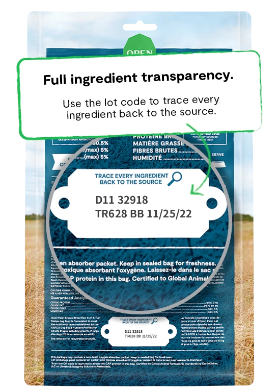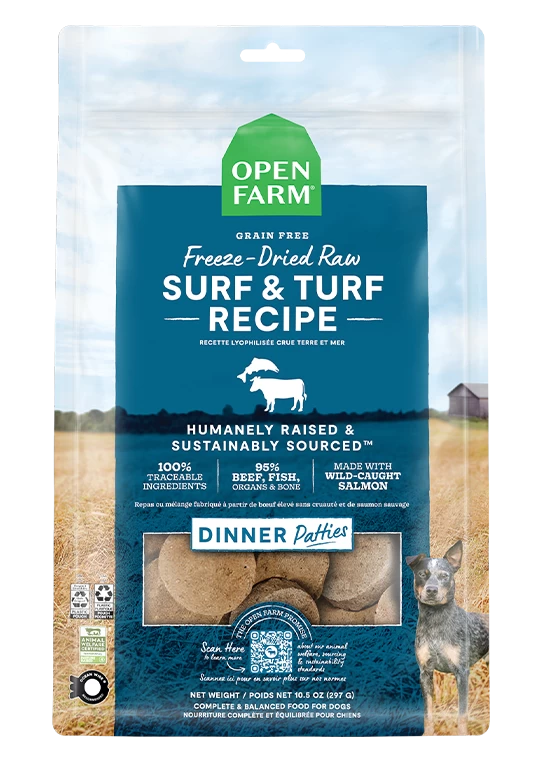 The most convenient way to feed your dog a real raw diet, this recipe provides a delicious complete and balanced meal. Our Surf & Turf recipe contains a special blend of 95% grass-fed beef, wild-caught salmon and nutrient rich organ meat including beef hearts, beef liver and beef kidneys. Open Farm Surf & Turf patties are a true prey-model diet your dog won’t be able to resist!