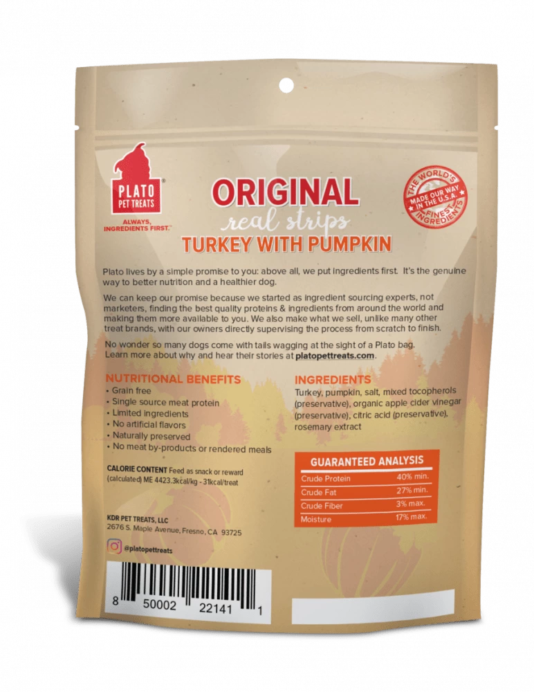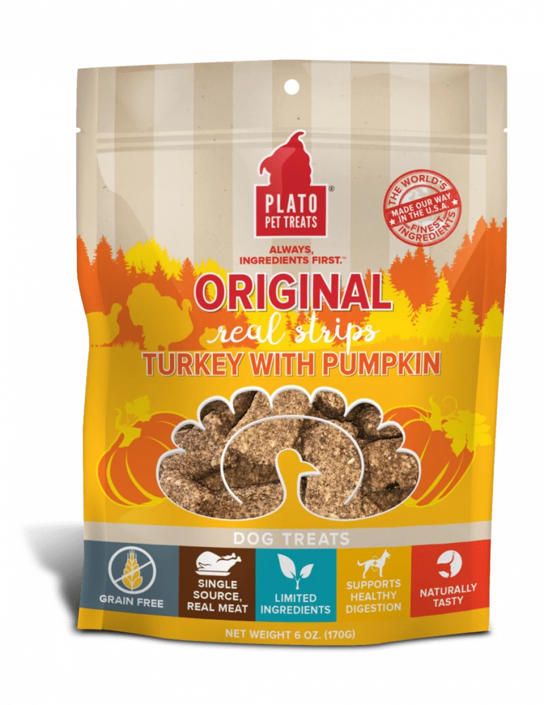 Real Strips Grain Free Turkey With Pumpkin are soft textured, meat bars that support healthy digestion and are just the right portion size and shape for chomping. Made with real turkey as the 1st ingredient, these treats are grain free, made with limited ingredients, are naturally preserved, and contain no artificial flavors, corn, wheat, or soy. They are easy to chew as is or can broken into smaller pieces for dogs of all sizes. And we take the extra time to air-dry them in batches in our USA facility instead of baking them in order to retain more of the ingredients’ inherent nutrients (but your dog will just think that they smell and taste amazing). It takes longer, but we think its worth it. Real Strips Grain Free also come in Turkey With Sweet Potato and Turkey With Cranberry.