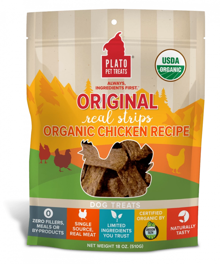 Our Organic Chicken Real Strips are Certified Organic, soft textured, meat bars, made with brown rice, and are just the right portion size and shape for chomping. Real Strips are made with real Organic Chicken as the 1st ingredient, are naturally preserved, and contain no artificial flavors, meat or fish by-products, rendered meals, corn, wheat, or soy. We take the extra time to air-dry Real Strips in our US facility instead of baking them in order to retain more of the ingredients’ inherent nutrients (and because they taste and smell great). Real Strips are easy to chew and can be broken into smaller pieces for dogs of all sizes.