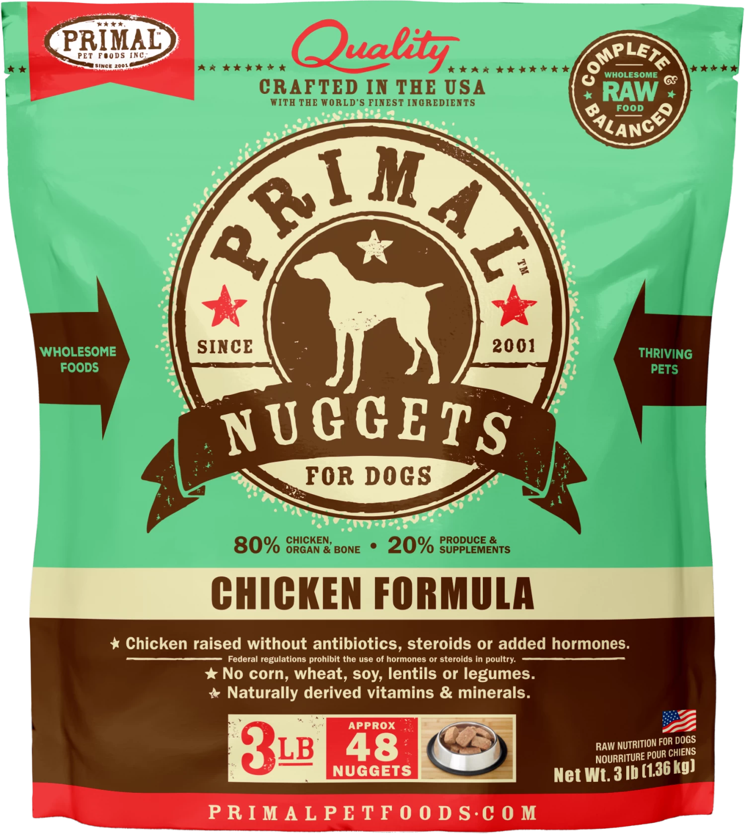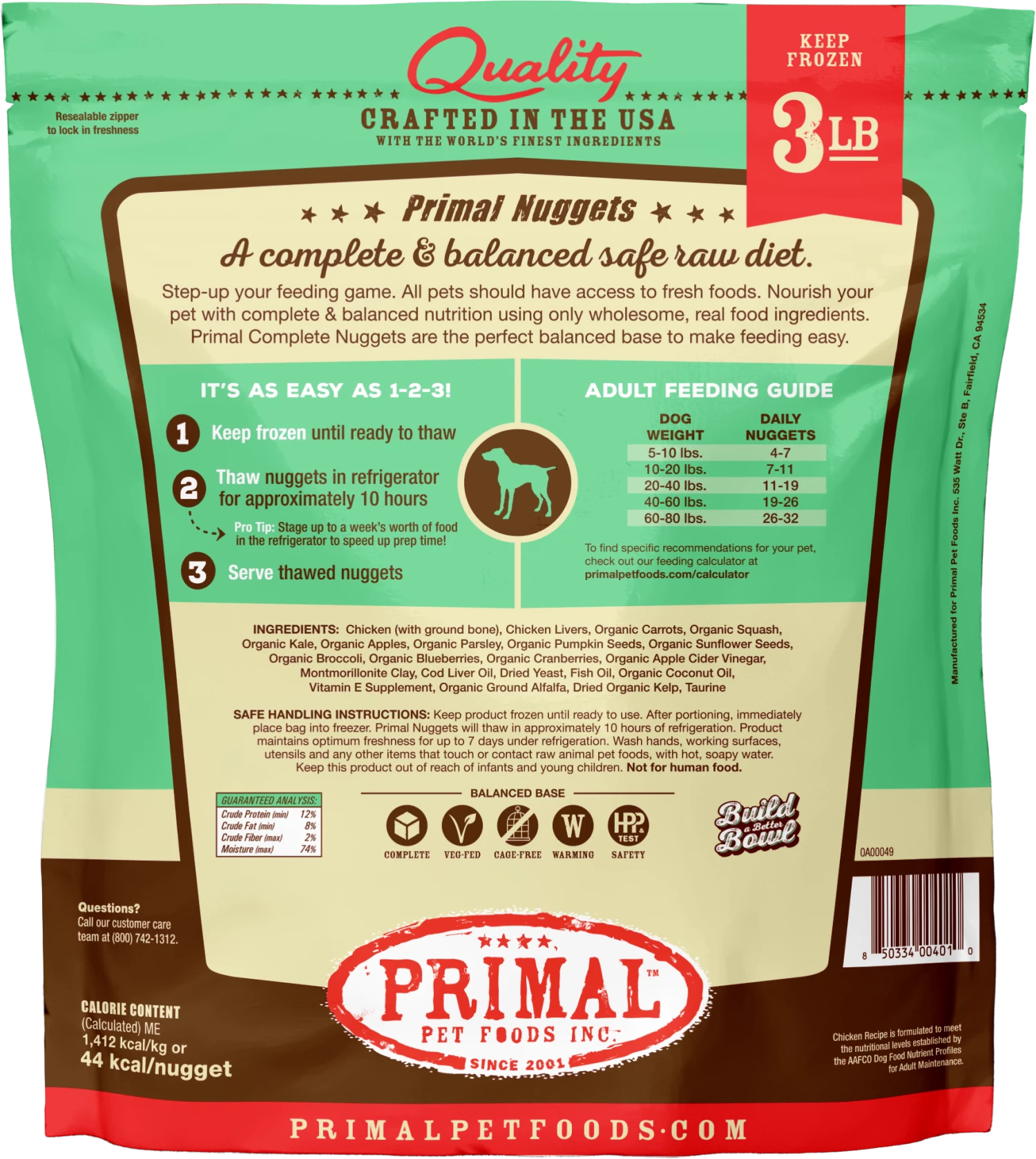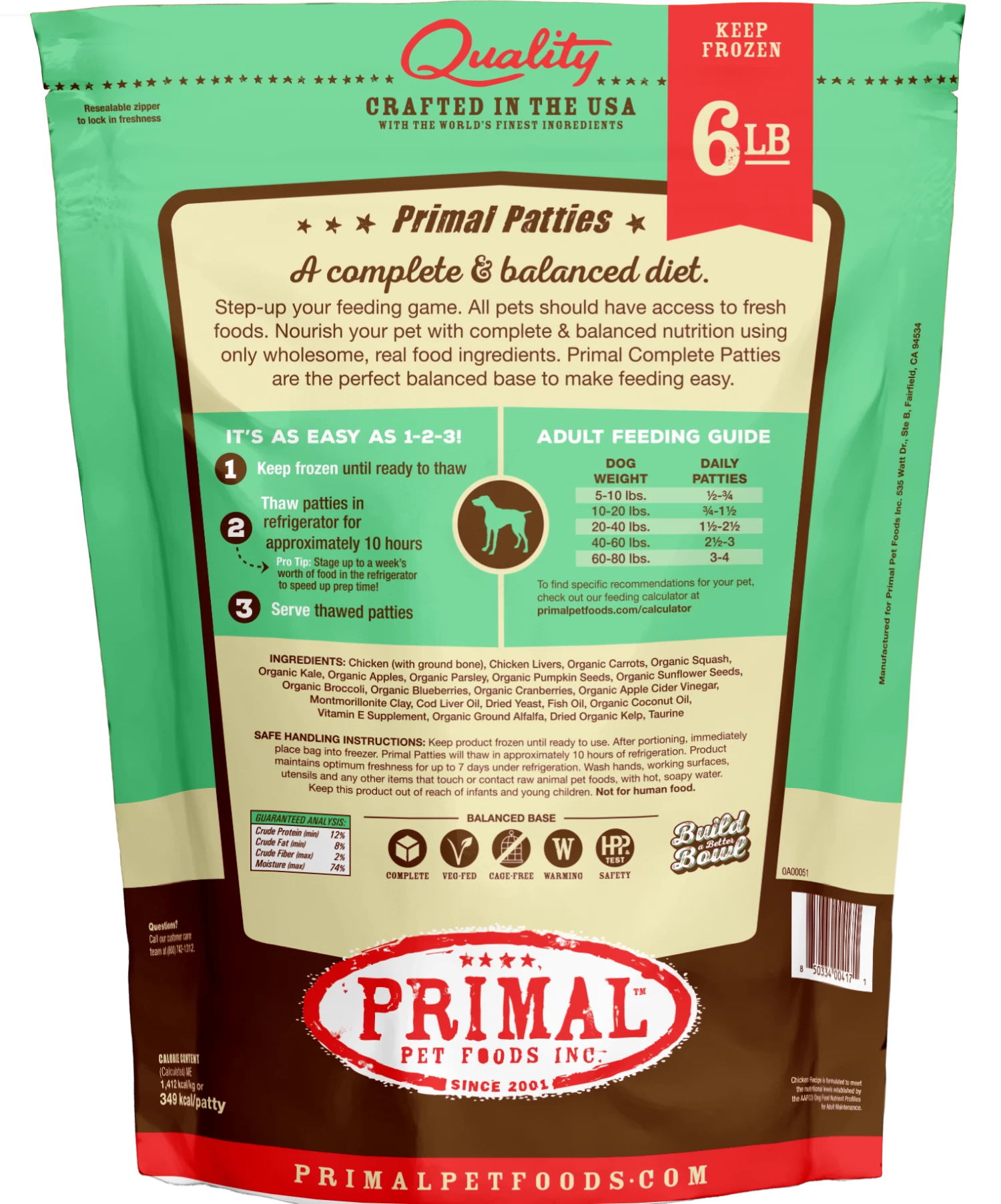 Primal Formulas are produced using only the freshest, 100% human-grade ingredients. Our poultry, meat and game are antibiotic and steroid free without added hormones. We incorporate certified organic produce, certified organic minerals and unrefined vitamins to fortify our complete and balanced diets. All Primal Formulas contain fresh ground bone for calcium supplementation. This combination of ingredients offers optimum levels of the amino acids (protein), essential fatty acids, natural-occurring enzymes, and necessary vitamins and minerals that are the building blocks for your pet’s healthy biological functions. All of the ingredients found in Primal Formulas are procured from ranches and farms throughout the United States and New Zealand that take pride in producing wholesome raw foods through natural, sustainable agriculture. Primal Formulas offer you the convenience and benefits of a well-balanced, safe and wholesome raw-food diet without having to grind, chop, measure or mix the ingredients yourself. At Primal Pet Foods, we have taken the time to carefully formulate and produce a nutritious, fresh-food diet that is easy for you to serve and delectable for pets to devour. The proof is watching them lick the bowl clean while thriving happily and healthfully!