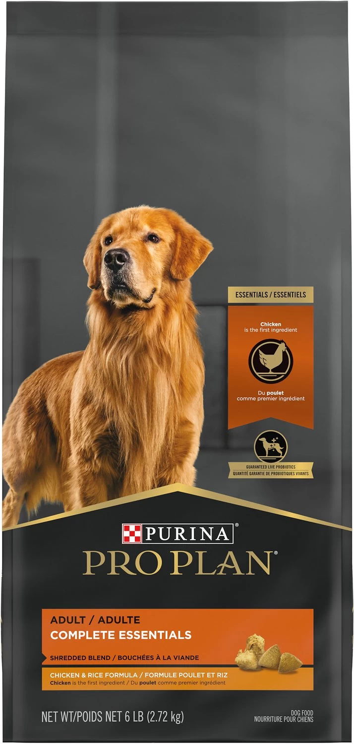 Get your dog excited about mealtime when you serve him Purina Pro Plan Brand Dog Food Shredded Blend Chicken and Rice Formula adult dry dog food. Real chicken as the first ingredient and rice, which is an excellent source of carbohydrates for energy, along with other high-quality ingredients create a wholesome meal with great flavor. The hard kibble and tender shredded pieces provide a texture sure to keep him engaged with every bite. Feel good about serving your dog 100 percent complete and balanced nutrition, and take comfort knowing that each serving contains optimal levels of protein and fat that help dogs maintain an ideal body condition. Vitamin A and linoleic acid, an omega-6 fatty acid, promote healthy skin and coat to keep him looking great, and guaranteed live probiotics help to support his digestive health. Formulated with high-quality protein and other essential nutrients, this Purina Pro Plan COMPLETE ESSENTIALS recipe helps support your beloved pet’s overall health and wellness.