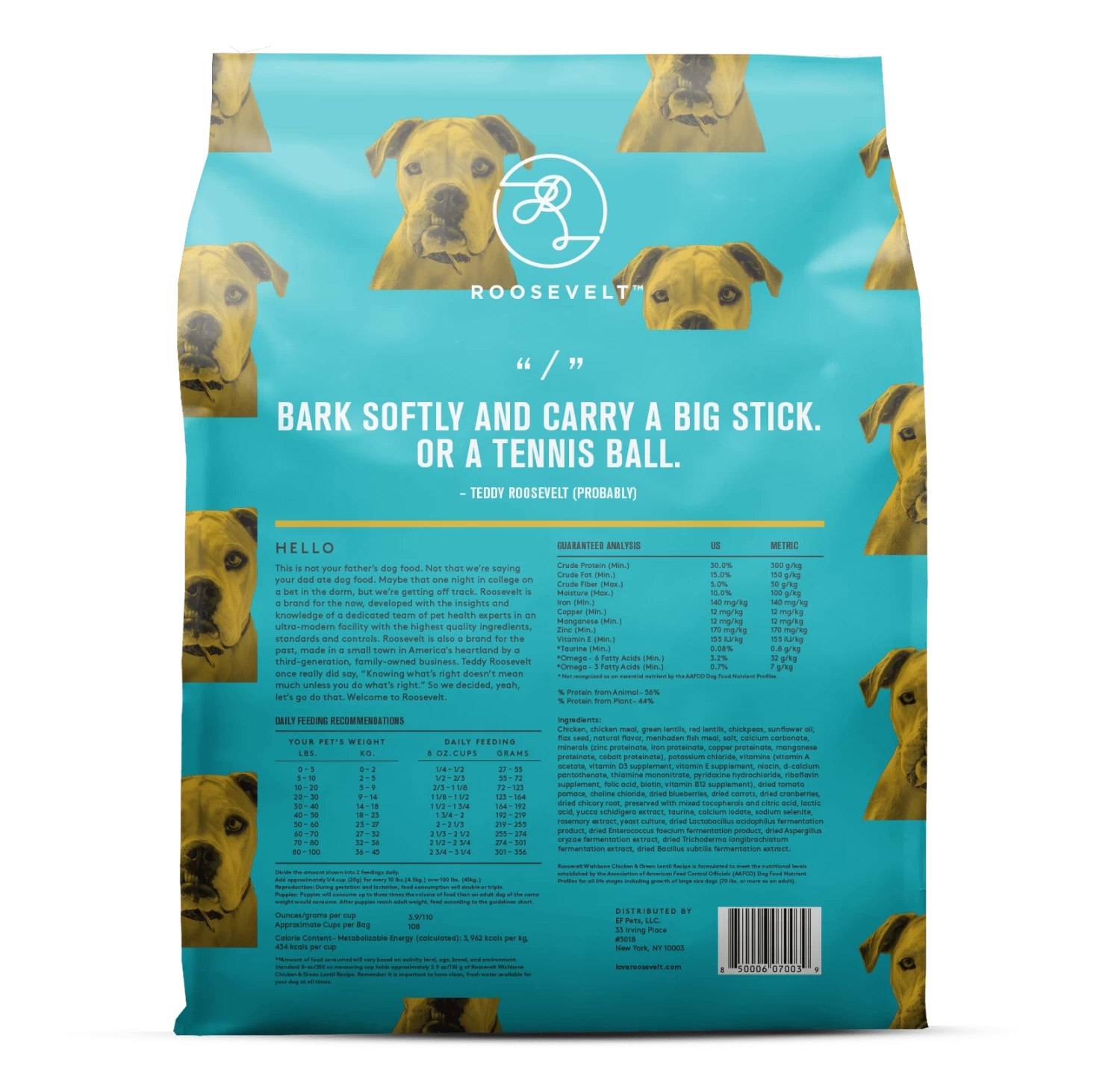 This new breed of dry dog food does things differently, and it shows. Not only is their distinct bag easy to spot, so is all the good stuff they put in it. And all the stuff they don’t. They’re all about transparency. Plus, Roosevelt’s made in America’s heartland, so for them farm-fresh is a given—they only use all-natural, whole foods and real meat protein is the first ingredient.