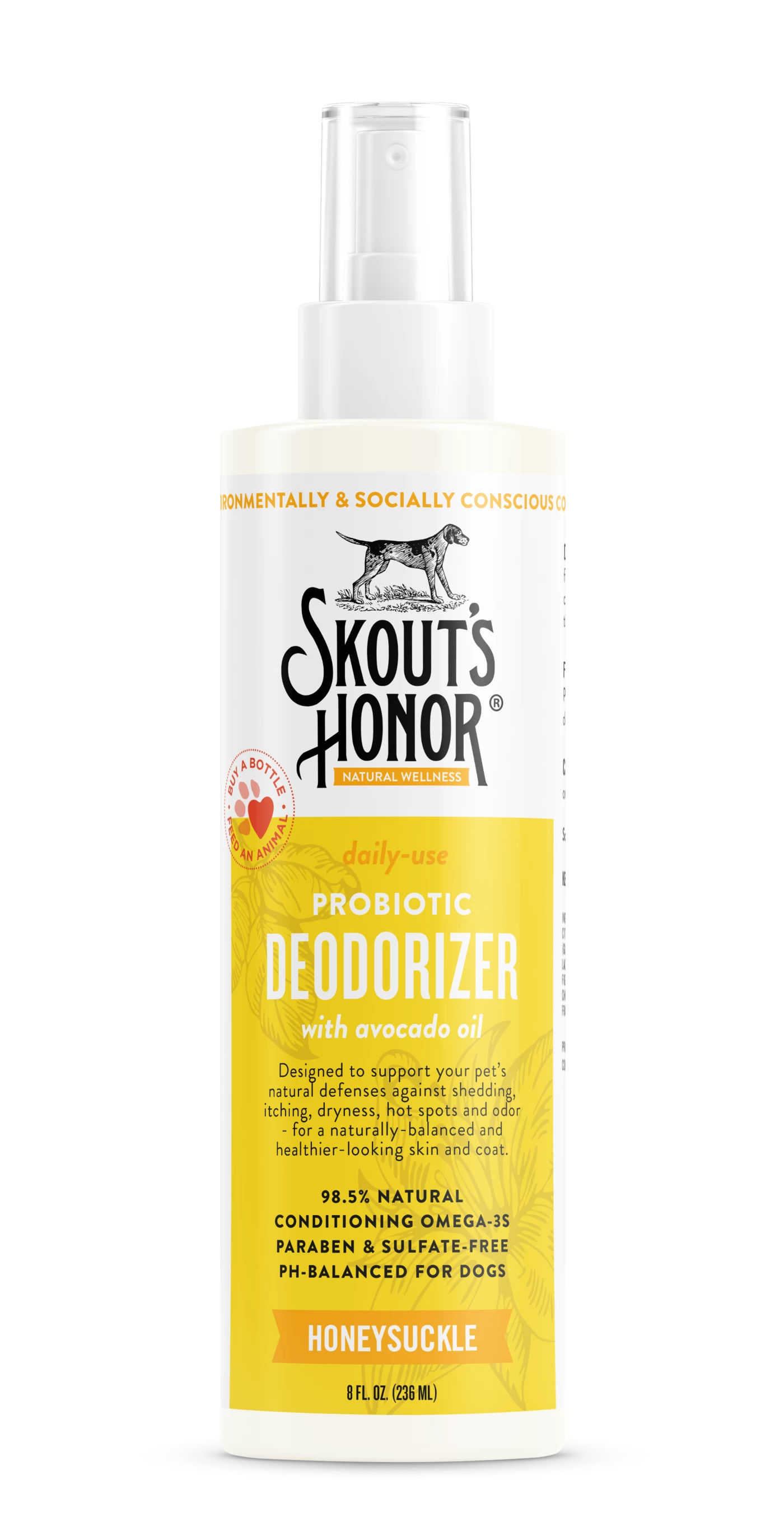 Skout’s Honor Probiotic Pet Deodorizer Honeysuckle hydrates and deodorizes the skin and coat for a fresher, better smelling pet in between washes.