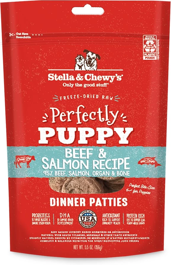 Help your puppy pal reach her optimal growth potential with Stella & Chewy’s Perfectly Puppy Beef & Salmon Dinner Patties Freeze-Dried Raw Dog Food. These dinner patties were crafted with the philosophy that our furry friends thrive on the same diet they would eat in the wild, which is why they are made with real grass-fed beef and wild-caught salmon! High in protein, this recipe is made from 95% meat, organs and bone that has been finely grounded, so your pal can safely get the nutrition she needs to support lean, healthy muscle growth. Best of all each freeze-dried raw patty contains probiotics to support digestion, antioxidants to support immunity and DHA to support you buddy’s brain development!