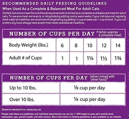 When used as a complete & balanced meal for adult cats: Stella’s Solutions meet the nutritional requirements to be fed as a complete and balanced meal for adult cats. To use as a meal, serve as is, or rehydrate by adding cool or warm water. If your cat does not regularly drink water at mealtime, we recommend rehydrating by adding 1/2 cup of water per 1 cup of food. If your cat prefers dry food, always have ample fresh water available at mealtime. Number of cups per day* (When used as a complete meal): Body Weight (lbs.) Adult # of Cups 6 1 8 1 10 1 1/4 12 1 1/2 14 1 3/4 Number of cups per day* (When mixed with other food) Up to 10 lbs. 1/8 cup per day Over 10 lbs. 1/4 cup per day *Based on standard 8 oz. measuring cup Please note that these are guidelines, and individual requirements can vary by +/- 50% based on your pet’s activity level, metabolism, age, general health, and other factors. More information on feeding guidelines is also available on our website.