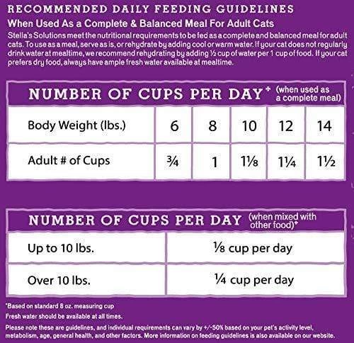 When used as a complete & balanced meal for adult cats: Stella’s Solutions meet the nutritional requirements to be fed as a complete and balanced meal for adult cats. To use as a meal, serve as is, or rehydrate by adding cool or warm water. If your cat does not regularly drink water at mealtime, we recommend rehydrating by adding 1/2 cup of water per 1 cup of food. If your cat prefers dry food, always have ample fresh water available at mealtime. Number of cups per day* (When used as a complete meal): Body Weight (lbs.) Adult # of Cups 6 3/4 8 1 10 1 1/8 12 1 1/4 14 1 1/2 Number of cups per day* (When mixed with other food) Up to 10 lbs. 1/8 cup per day Over 10 lbs. 1/4 cup per day *Based on standard 8 oz. measuring cup Please note that these are guidelines, and individual requirements can vary by +/- 50% based on your pet’s activity level, metabolism, age, general health, and other factors. More information on feeding guidelines is also available on our website.