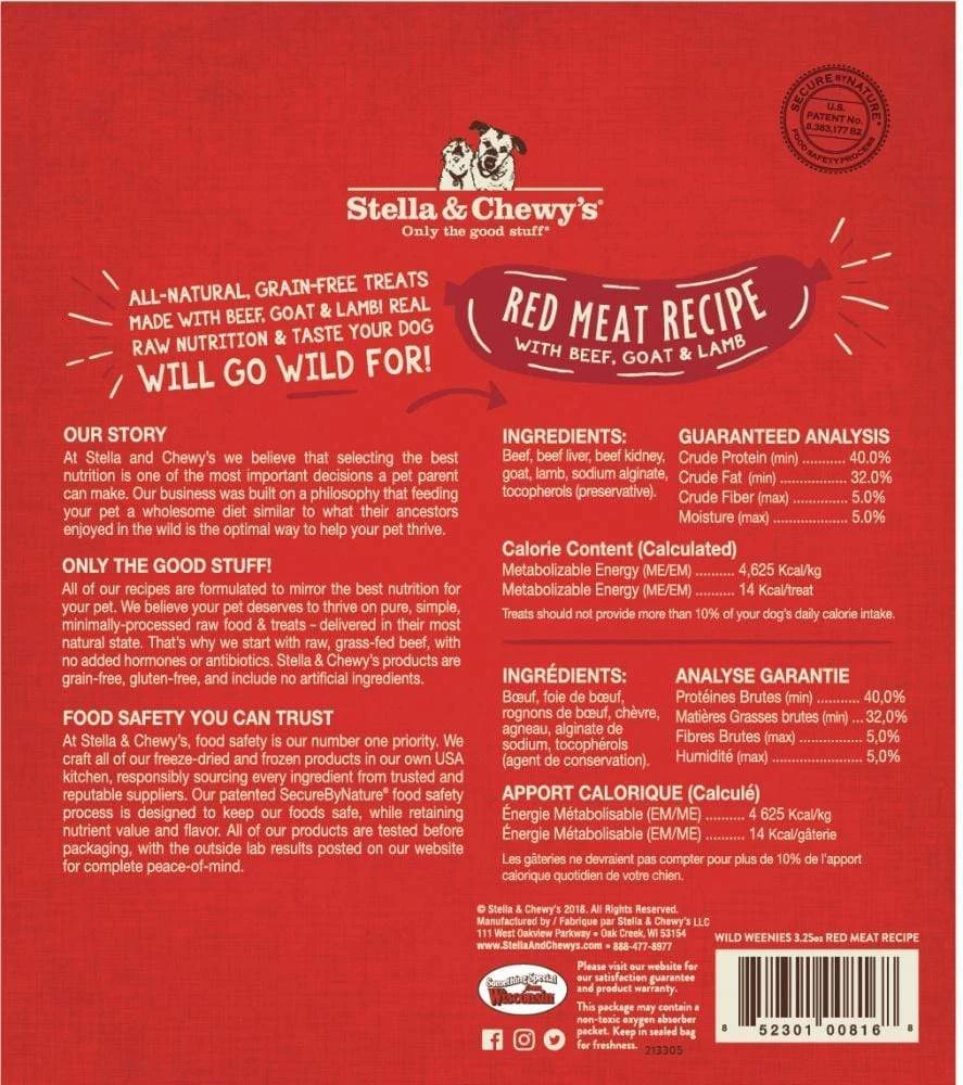 Stella & Chewy’s Freeze-Dried Raw Red Meat Wild Weenies Dog Treats are made with a beef, goat & lamb recipe in the USA. Wild Weenies are grain-free, gluten-free and include no artificial ingredients. Stella and Chewy’s was built on a philosophy that feeding your pet a wholesome diet similar to what their ancestors enjoyed in the wild is the optimal way to help your pet thrive. These treats offer real raw nutrition & taste your dog will go wild for!