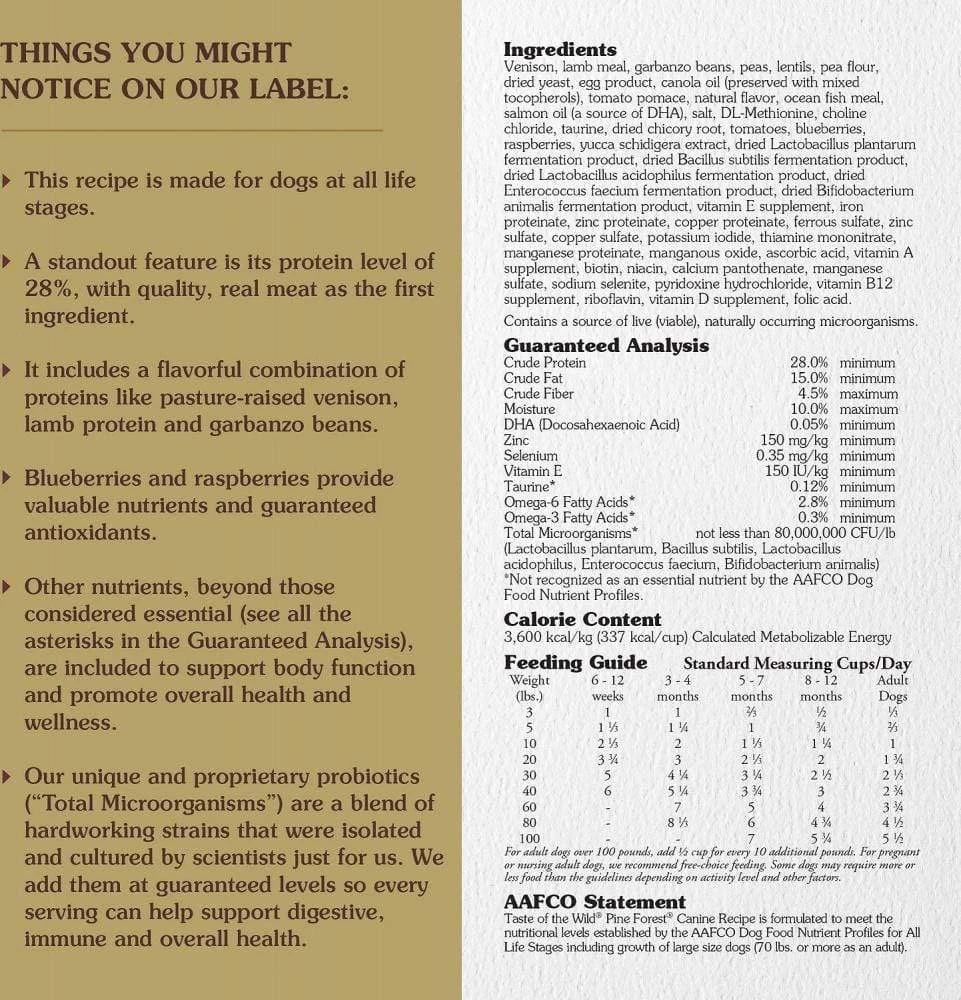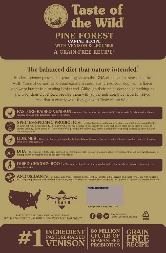 Lean venison is a highly digestible, tasty alternative for dogs that may be sensitive to other protein sources, or that just love the wild game taste of venison. Probiotics and prebiotic fiber help support healthy digestion, while the perfect balance of omega fatty acids, vegetables, fruits and protein sources make this a well-rounded, nutrient-packed formula. Your dog craves a taste of the wild. Go ahead and give him one.