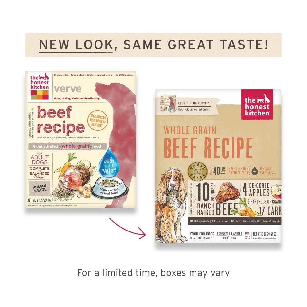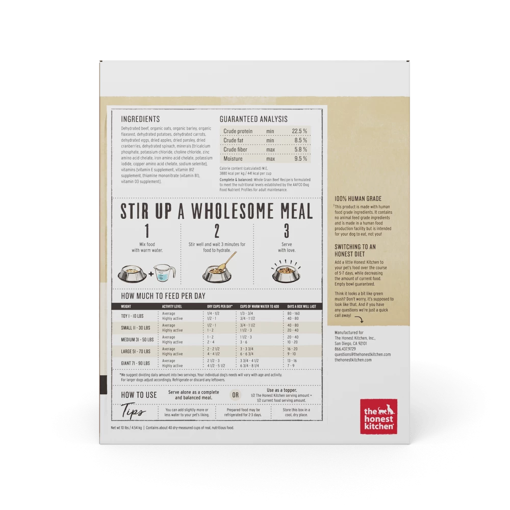 Before there was The Honest Kitchen, there was this single recipe, made by our company founder—Lucy, in her own (honest) kitchen. This meat-and-potatoes dish is greater than the sum of its parts, and it had to be since it’s the one that started it all. It’s claim to fame is that it was the world’s FIRST human grade pet food. See what all the fuss is about with tasty ranch-raised beef, fresh produce, and whole grain goodness. This complete and balanced dish nourishes adult and senior dogs looking to maintain their doggy figures. It’s low calorie, low protein, low fat, but high in yumminess.
