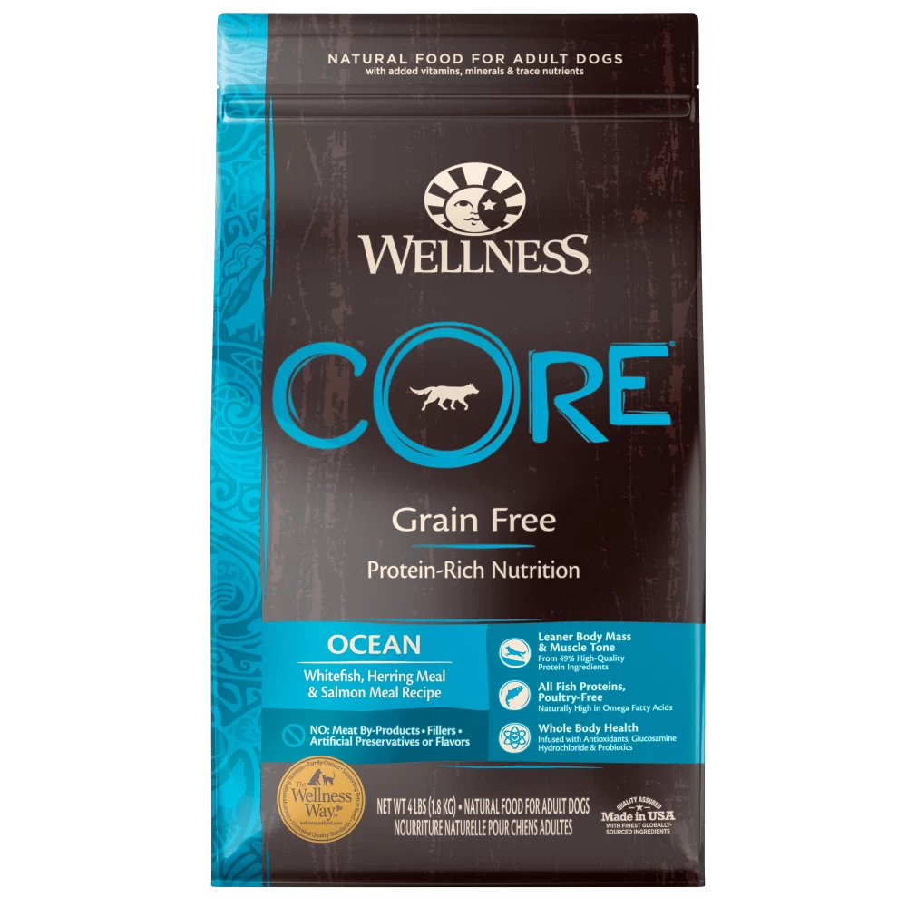 Fresh fish is always on the menu with Wellness CORE Grain Free Ocean Fish Dry Dog food. With protein-rich whitefish as the main ingredient, followed by herring meal, menhaden fish meal, and salmon meal, the natural fish omegas which aid in healthy skin and coats. Wellness CORE Grain Free Ocean Fish Dry Dog food includes a healthy serving of fruits and veggies such as apples, blueberries, kale, spinach and broccoli. This formula also includes glucosamine to support healthy joints, pre and probiotics to help digestion, and is enhanced with antioxidants to support cellular health.