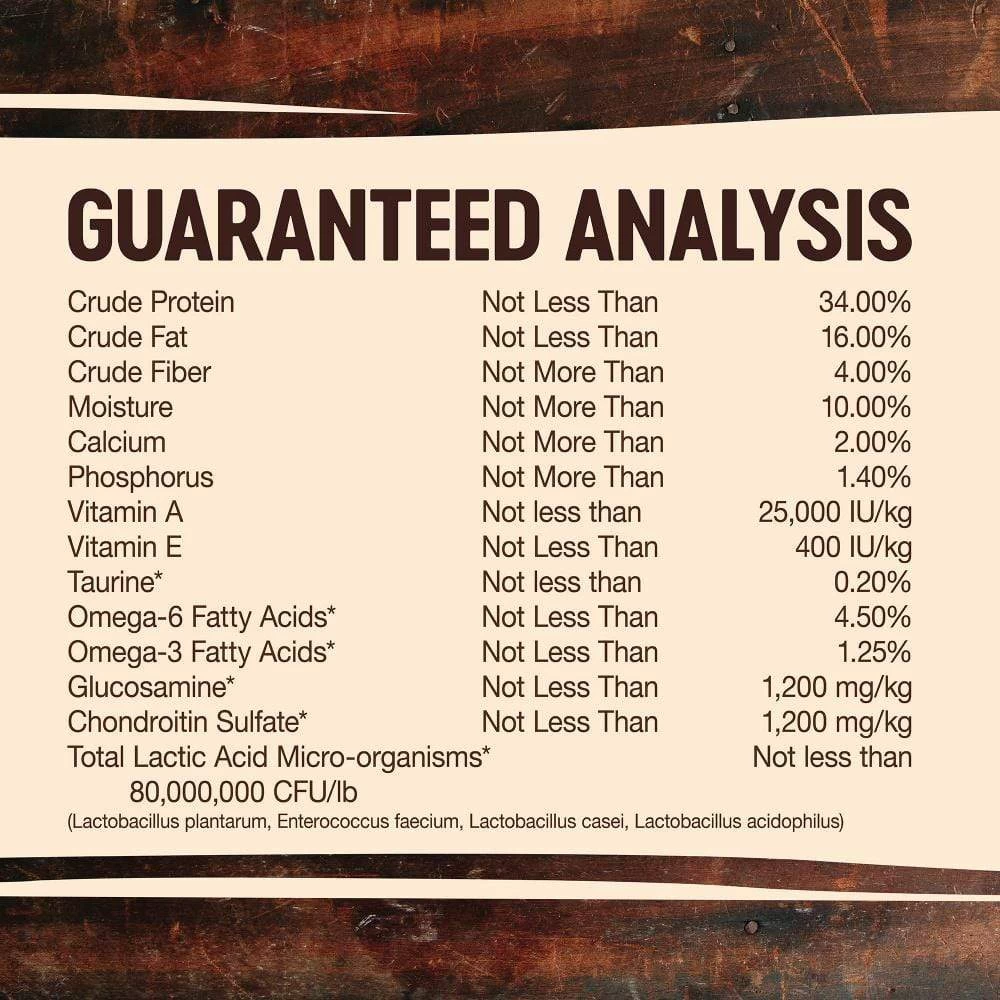 Deboned Turkey, Turkey Meal, Chicken Meal, Peas, Potatoes, Dried Ground Potatoes, Chicken Fat (preserved with Mixed Tocopherols), Tomato Pomace, Chicken Liver, Natural Chicken Flavor, Ground Flaxseed, Salmon Oil, Spinach, Vitamin E Supplement, Broccoli, Carrots, Choline Chloride, Parsley, Apples, Blueberries, Kale, Sweet Potatoes, Taurine, Mixed Tocopherols added to preserve freshness, Zinc Proteinate, Zinc Sulfate, Glucosamine Hydrochloride, Chondroitin Sulfate, Calcium Carbonate, Niacin, Ferrous Sulfate, Iron Proteinate, Beta-Carotene, Vitamin A Supplement, Copper Sulfate, Thiamine Mononitrate, Copper Proteinate, Manganese Proteinate, Manganese Sulfate, d-Calcium Pantothenate, Sodium Selenite, Pyridoxine Hydrochloride, Riboflavin, Chicory Root Extract, Yucca Schidigera Extract, Vitamin D3 Supplement, Biotin, Calcium Iodate, Vitamin B12 Supplement, Folic Acid, Ascorbic Acid (Vitamin C), Dried Lactobacillus plantarum Fermentation Product, Dried Enterococcus faecium Fermentation Product, Dried Lactobacillus casei Fermentation Product, Dried Lactobacillus acidophilus Fermentation Product, Rosemary Extract, Green Tea Extract, Spearmint Extract.