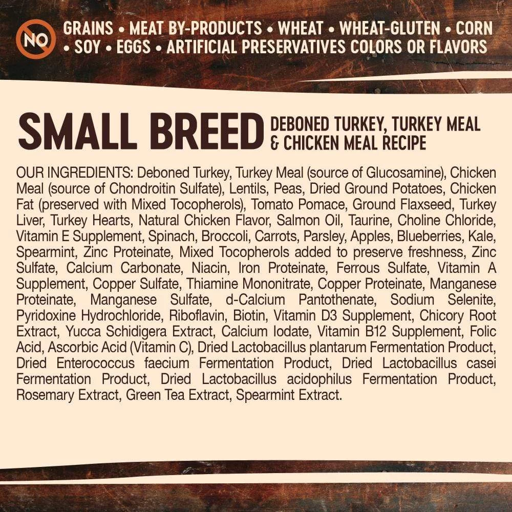 Deboned Turkey, Turkey Meal, Chicken Meal, Potatoes, Peas, Dried Ground Potatoes, Freeze-Dried Turkey, Chicken Fat (preserved with Mixed Tocopherols), Tomato Pomace, Natural Chicken Flavor, Ground Flaxseed, Salmon Oil, Yucca Schidigera Extract, Choline Chloride, Spinach, Vitamin E Supplement, Broccoli, Carrots, Parsley, Apples, Blueberries, Kale, Sweet Potatoes, Taurine, Spearmint, Mixed Tocopherols added to preserve freshness, Zinc Proteinate, Zinc Sulfate, Glucosamine Hydrochloride, Chondroitin Sulfate, Calcium Carbonate, Niacin, Ferrous Sulfate, Iron Proteinate, Beta-Carotene, Vitamin A Supplement, Copper Sulfate, Thiamine Mononitrate, Copper Proteinate, Manganese Proteinate, Manganese Sulfate, d-Calcium Pantothenate, Sodium Selenite, Pyridoxine Hydrochloride, Riboflavin, Chicory Root Extract, Vitamin D3 Supplement, Biotin, Calcium Iodate, Vitamin B12 Supplement, Folic Acid, Ascorbic Acid (Vitamin C), Dried Lactobacillus plantarum Fermentation Product, Dried Enterococcus faecium Fermentation Product, Dried Lactobacillus casei Fermentation Product, Dried Lactobacillus acidophilus Fermentation Product, Rosemary Extract, Green Tea Extract, Spearmint Extract.